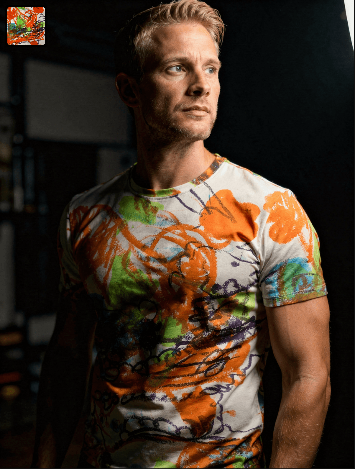 Cinematic Studio Image in a Dark room, Cinematic Light, a man with blonde hair is wearing a tshirt with the same pattern as in Image 1